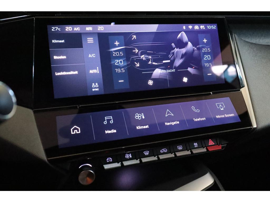 Achterbank in delen neerklapbaar, Achteruitrijcamera, Airbag(s) hoofd achter, Airbag(s) hoofd voor, Airbag(s) side voor, Airbag bestuurder, Airbag passagier, Alarm klasse 1(startblokkering), Anti Blokkeer Systeem, Anti doorSlip Regeling, Apple Carplay/Android Auto, Armsteun achter, Autonomous Emergency Braking, Bandenspanningscontrolesysteem, Bestuurdersstoel in hoogte verstelbaar, Binnenspiegel automatisch dimmend, Bluetooth, Brake Assist System, Buitenspiegels elektrisch inklapbaar, Buitenspiegels elektrisch verstel- en verwarmbaar, Buitenspiegels met verlichting, Chroom delen exterieur, Cruise control adaptief met stop&go, Dab, Dimlichten automatisch, Dodehoek detector, Elektrische ramen achter, Elektrische ramen voor, Elektronisch Stabiliteits Programma, Elektronische remkrachtverdeling, Head-up display, Hill hold functie, Hoofdsteunen achter, Keyless start, LED achterlichten, LED dagrijverlichting, LED koplampen, Lendesteunen (verstelbaar), Lichtmetalen velgen 17", Metaalkleur, Multimedia-voorbereiding, Navigatiesysteem full map, PEUGEOT i-Connect Advanced Nav (ZJ53), Parkeersensor achter, Parkeersensor voor, Passagiersstoel in hoogte verstelbaar, Radio, Regensensor, Sportstoelen, Spraakbediening, Stuur verstelbaar, Uitparkeer waarschuwing, Verkeersbord detectie, Vermoeidheids herkenning, Volledig digitaal instrumentenpaneel, achterbank in 3 delen neerklapbaar met skiluik, bots waarschuwing systeem, electronic climate control, extra getint glas achter, kunstlederen/stof bekleding, multimedia scherm standaard, stuur leder, stuur multifunctioneel