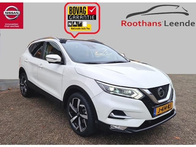 2 bekerhouders achter, 2 bekerhouders voor, 3-punts veiligheidsgordels achter, 3-punts veiligheidsgordels voor, 5'' Kleuren TFT instrumentenpaneel, 12V aansluiting, 19'' lichtmetalen velgen, ABS (Anti-blokkeersysteem), Achterbankleuning in delen neerklapbaar (60/40), Actieve hoofdsteunen voor, Adaptive Front Lighting System, Audiosysteem met CD-speler, USB-aansluiting, stuurwielbediening en 6 luidsprekers, Autohold functie, Automatisch dimmende binnenspiegel, Automatisch in-/uitschakelende koplampen, Automatisch inklapbare buitenspiegels, Bandenspanningscontrolesysteem, Bi LED koplampen, Bluetooth, Buitenspiegelkappen in carrosseriekleur, Centrale deurvergrendeling met afstandsbediening, Chassis Control Systeem (Active Trace Control, Active Ride Control, Xtronic Active Engine Brake), Chromen raam omlijsting, Cruise control en speedlimiter met stuurwielbediening, Detectie van bewegende objecten, Digital audio broadcasting (DAB+), Dynamische bochtenverlichting, EBD (elektronische remkrachtverdeler), ESP (Electronic Stability Program), Elektrisch bedienbare ramen voor en achter met sneltoetsen, Elektrisch verstelbare bestuurdersstoel, Elektrisch verstelbare en verwarmbare buitenspiegels, Elektronische parkeerrem, Elektronische stuurbekrachtiging, Extra getint glas (achterste zijramen en achterruit), Flexibele bagageruimte indeling, Gescheiden automatische airconditioning (2 zones), Gordijn airbags, Haaienvin-antenne, Half lederen bekleding, Hoofdsteunen achter, ISOFIX-bevestigingspunten achter (2), In hoogte en diepte verstelbaar stuurwiel, In hoogte verstelbare bestuurdersstoel, In hoogte verstelbare passagiersstoel, Intelligent Key met startknop, Intelligente parkeerassistent, Interieur ambiance verlichting, LED dagrijverlichting, LED dagrijverlichting met geïntegreerde knipperlichten, LED verlichting achter, Lederen stuurwiel en versnellingspookknop, Lendensteunverstelling voorstoelen, Metallic lak, Middenarmsteun achter, Middenarmsteun voor, Mistlampen voor, NBAS (Nissan Brake Assist), New NissanConnect infotainmentsysteem met navigatiesysteem, Nissan Around View Monitor, NissanConnect navigatie, Nissan safety shield, Panoramisch glazen dak, Parkeersensoren (voor/achter), Portiergrepen in carrosseriekleur, Pro-PILOT Adap-Cruise, ProPILOT Intelligent Parking System, Regensensor, Reparatiekit voor de banden, Startonderbreking, Uitschakelbare passagiersairbag, Verwarmbare voorstoelen, Verwarmde voorruit, Voor- en zijairbags, Voorstoelen met sportdesign en geïntegreerde hoofdsteunen, Zilverkleurige dakrails, Zilverkleurige stylingplaten achterbumper