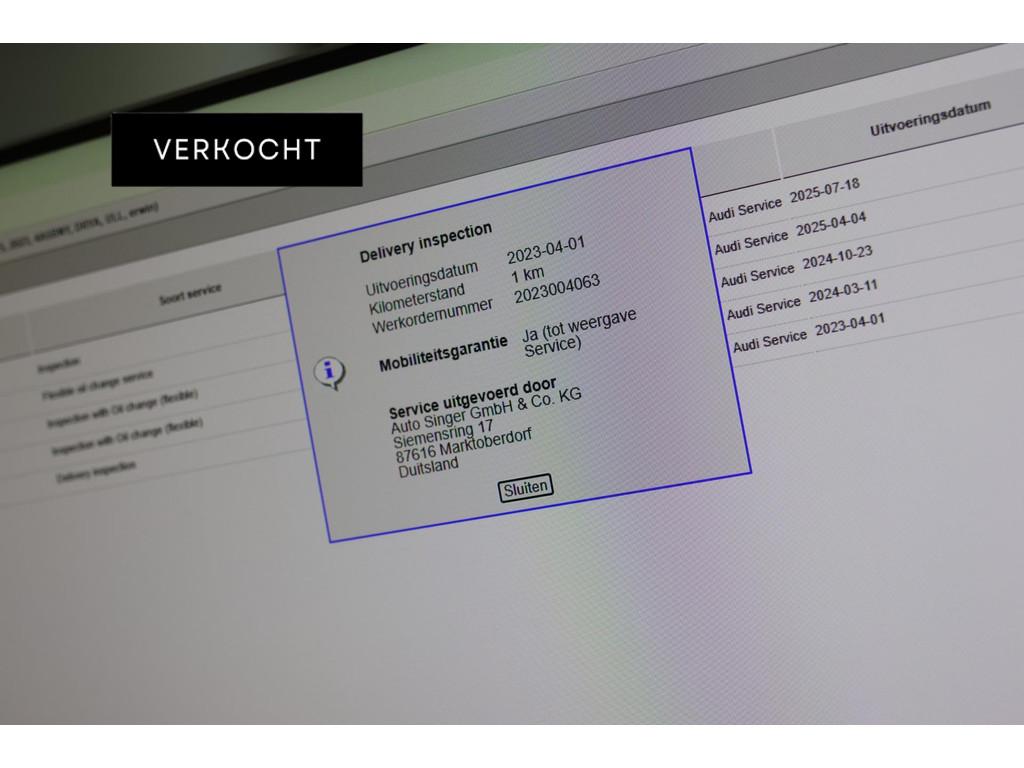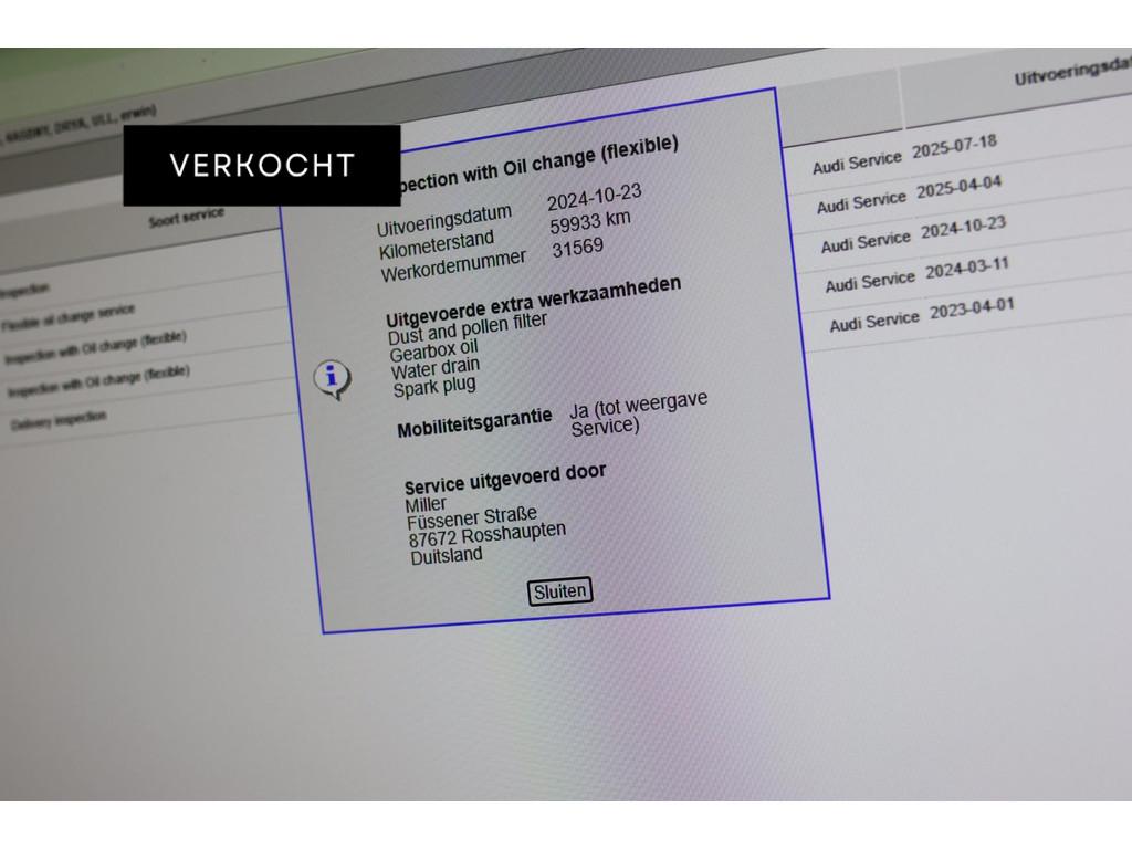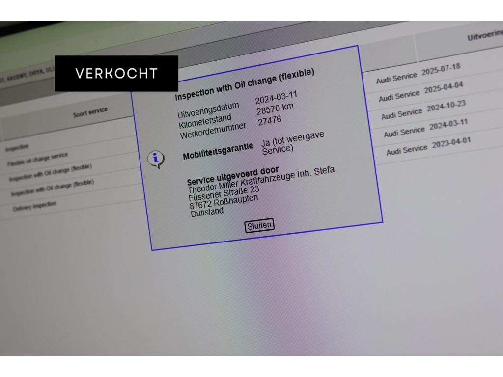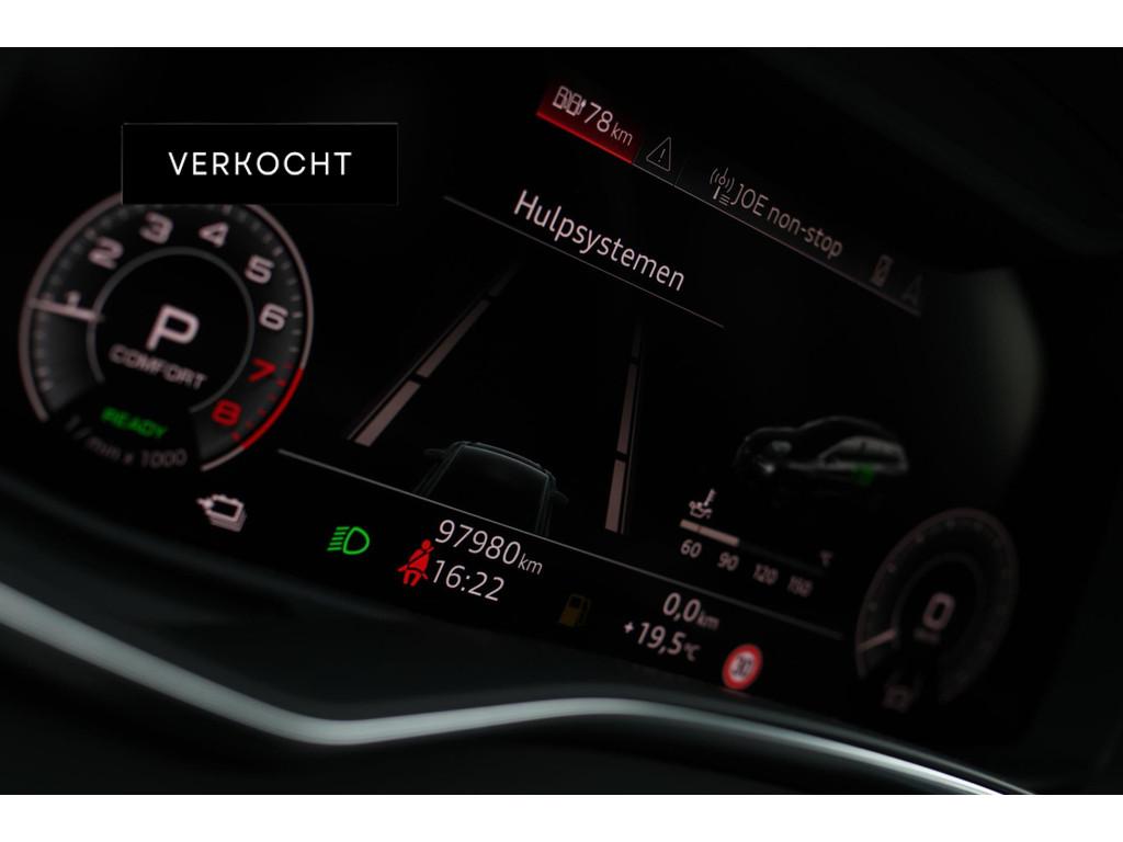 360 Camera, Accident Avoidance System, Achterbank in delen neerklapbaar, Achteruitrijcamera, Adaptief Demping Systeem (ADS), Adaptief onderstel, Adaptive cruise control, Airbag(s) hoofd achter, Airbag(s) hoofd voor, Airbag(s) side voor, Airbag bestuurder, Airbag passagier, Airco, Airco separaat achter, Alarmsysteem, Aluminium interieur afwerking, Android Auto, Anti Blokkeer Systeem (ABS), Apple Carplay, Armsteun, Armsteun achter, Armsteun voor, Assistentie pakket Parking, Audi Sound, Audi connect, Audio installatie, Autotelefoonvoorbereiding met Bluetooth, Binnenspiegel automatisch dimmend, Black pakket, Boordcomputer, Bots herkenning en activatie, Bots waarschuwing systeem, Brake Assist System, Buitenspiegel(s) automatisch dimmend, Buitenspiegels elektrisch inklapbaar, Buitenspiegels elektrisch met geheugen, Buitenspiegels elektrisch verstelbaar, Buitenspiegels verwarmbaar, Centrale deurvergrendeling met afstandsbediening, Connected services, Cruise control, Cruise control adaptief met Stop&Go, DAB, DAB-ontvanger, Dakrails, Dimlichten automatisch, Drive Select, Electronic Brake Distribution (EBD), Electronic Stability Program (ESP), Electronic climate controle, Elektrisch bedienbare achterklep, Elektrisch bedienbare achterklep met sensorsturing, Elektrische achterklep met voetsensor, Elektrische ramen achter, Elektrische ramen voor, Elektrisch glazen panorama-dak, Elektrisch verstelbare bestuurdersstoel met geheugen, Elektrisch verstelbare passagiersstoel, Extra getint glas, Grootlicht-assistent, Head-up display, Interieur voorverwarmingsinstallatie, Keyless-pakket, Keyless entry, Keyless entry/go, Keyless start, Koplampreiniging, LED achterlichten, LED dagrijverlichting, Lane Assist, Led achter met dynamische richtingaanwijzer, Lederen interieurdelen, Lederen sportstuur, Lederen stuurwiel, Lederen versnellingspook, Leder pakket middenconsole, Lendesteunen (verstelbaar), Lichtmetalen velgen 21'', Luxe lederen bekleding, Luxe lederen interieur, Matrix LED koplampen, Matrix led voor met dynamische richtingaanwijzer, Metallic lak, Middenarmsteun, Multimedia-voorbereiding, Navigatie, Navigatie full map, Oplaadmogelijkheid, Panoramadak, Parkeer-assistent, Parkeersensor achter, Parkeersensoren achter, Parkeersensor voor, RS-Stoelen, Regensensor, Rijstrooksensor, Rijstrooksensor met correctie, Rondomzicht camera, Ruitensproeiers verwarmbaar, S Line exterieur, Schakelmogelijkheid aan stuurwiel, Sportonderstel, Sportstoelen, Sportstuur, Standkachel, Startblokkering, Stuurbekrachtiging, Stuurwiel multifunctioneel, Stuurwiel verwarmd, Telefoonintegratie, Telefoonvoorbereiding, Tractie Controle Systeem (TCS), Trekhaak, Veiligheids-pakket, Verkeersbord detectie, Verwarmde voorstoelen, Virtual cockpit, Volledig digitaal display, Volledig digitaal instrumentenpaneel, Warmtewerend glas, Zwarte hemelbekleding, verwarmbare achterruit
