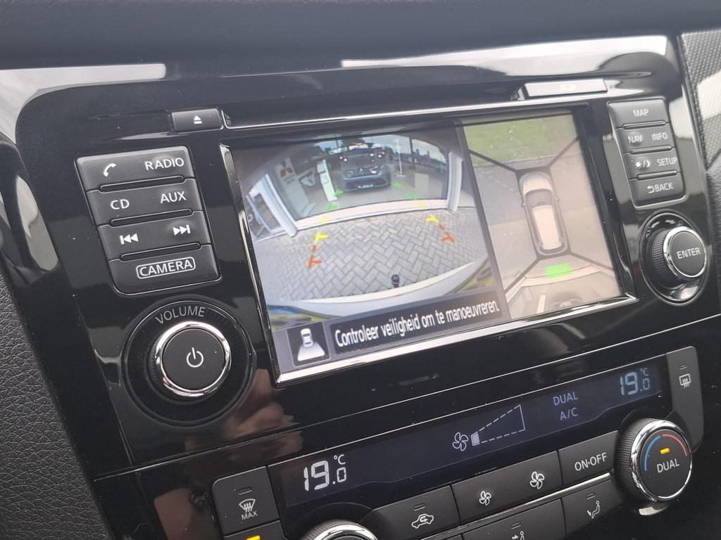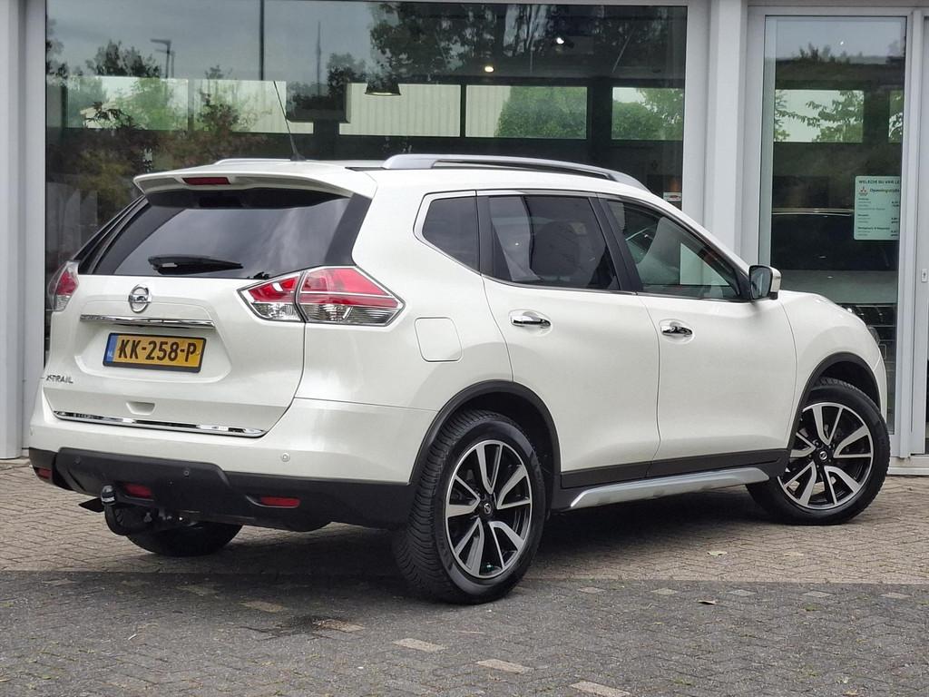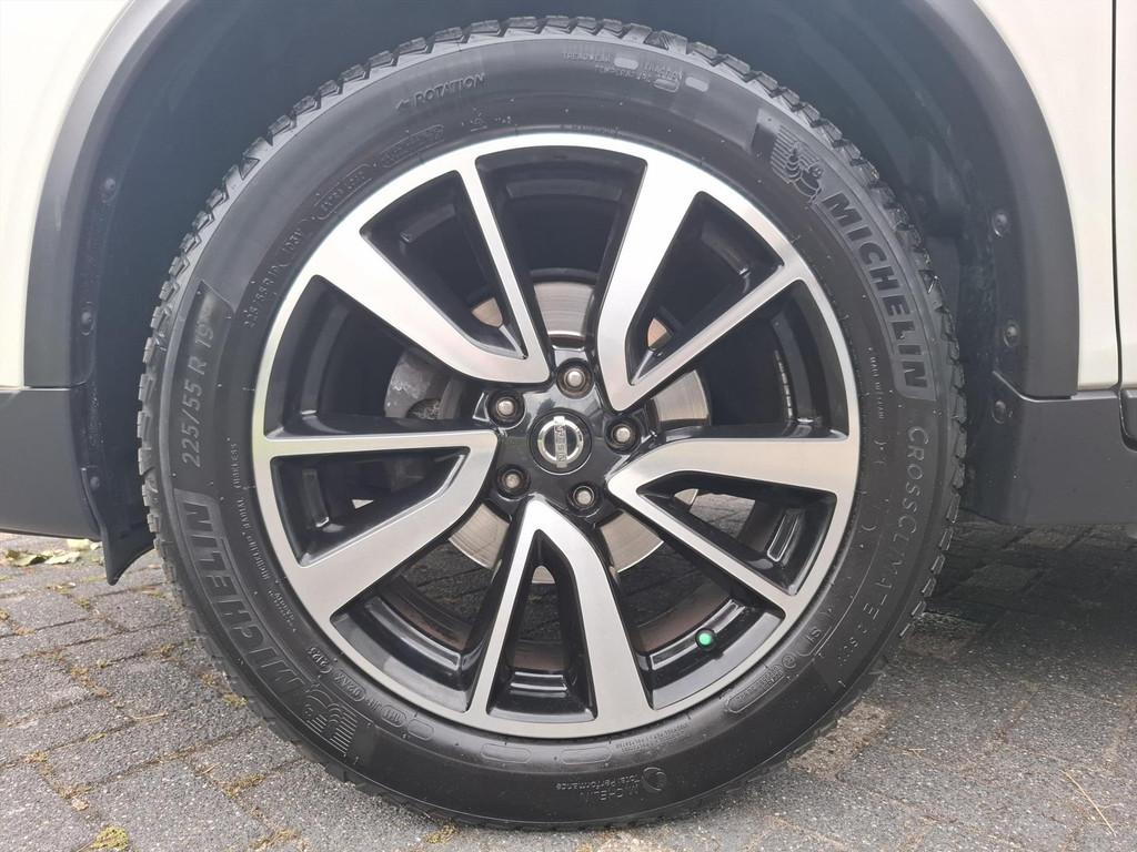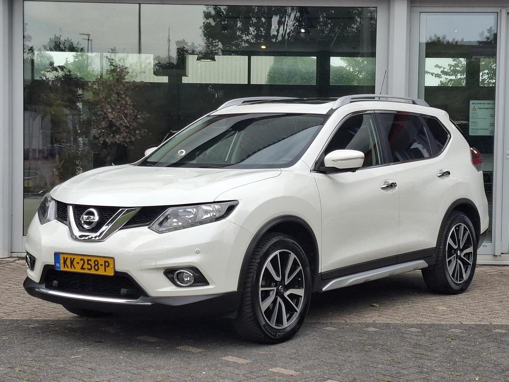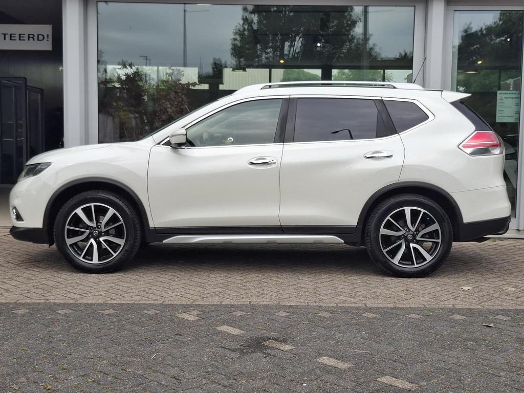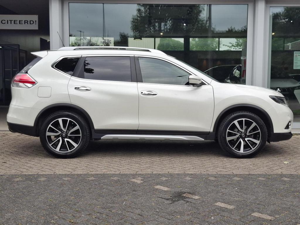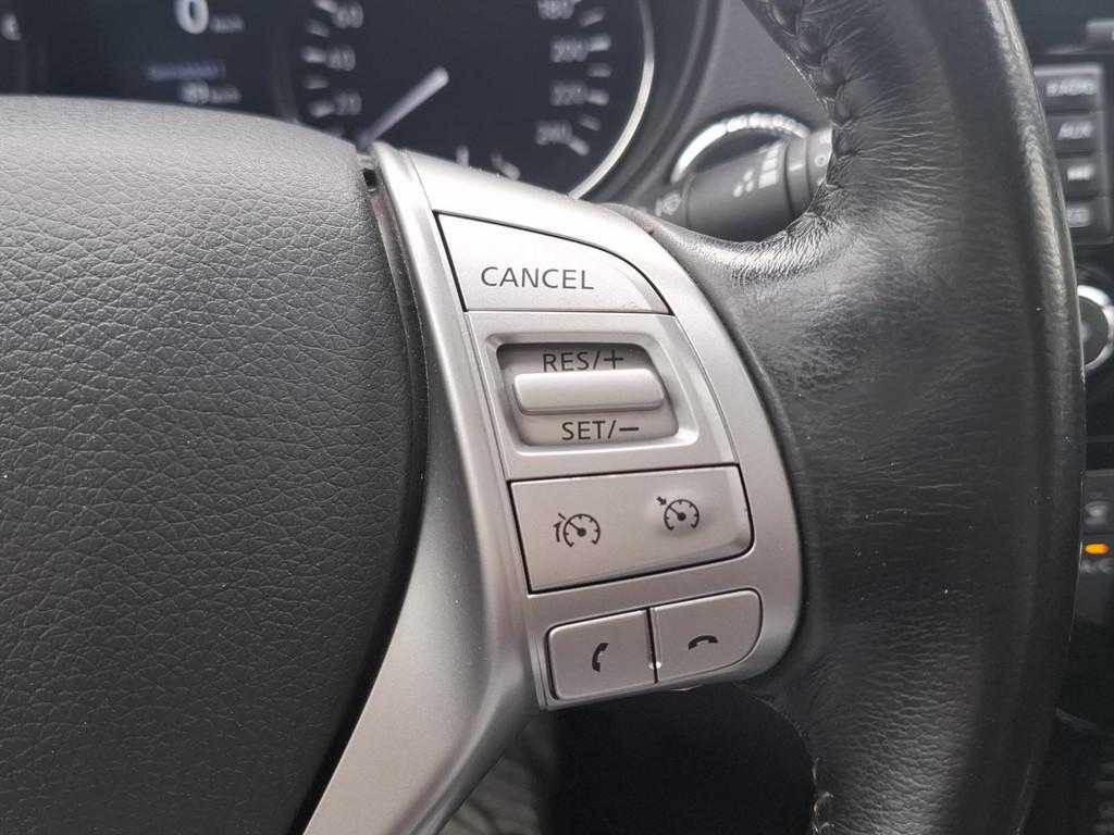 3-punts veiligheidsgordels achter, 3-punts veiligheidsgordels voor met gordelspanner, 5'' Kleuren TFT instrumentenpaneel, 7" TFT navigatiesysteem met verkeersinformatie en touchscreen in kleur met 3D kaarten voor Europa, 19'' Lichtmetalen velgen, ABS (Anti-blokkeersysteem), Achterbankleuning in delen neerklapbaar (60/40), Achteruitrijcamera, Airbag voorpassagier uitschakelbaar, Airco, Armsteun bestuurdersstoel, Automatische achterklep, Automatisch in-/uitschakelende koplampen, Bandenspanningscontrolesysteem, Binnenspiegel met automatische dimmer, Bluetooth - voor handsfree bellen, Centrale armsteun achterin met bekerhouder, Centrale portiervergrendeling, Chassis Control Systeem (Active Trace Control, Active Ride Control, Xtronic Active Engine Brake), Chromen portiergrepen, Chromen raam omlijsting, Climate control, Cruise control, Cruise control en speedlimiter met stuurwielbediening, Digital Audio Broadcasting (DAB+), Internet radio, Upgradable apps, ESP met deactivatieschakelaar, Elektrisch bedienbare ramen voor en achter, Elektrische handrem, Elektrisch inklapbare buitenspiegels, Elektrisch verstelbare en verwarmbare buitenspiegels, Elektronische Remkracht verdeling (EBD), Ergonomische voorstoelen, Extra getint glas (achterste zijramen en achterklep), Flexibele bagageruimte indeling, Geblindeerde ruiten achter, Gescheiden automatische airconditioning (2 zones), Halogeen koplampen, Hellingproef, ISOFIX-bevestigingspunten voor 2 kinderzitjes, In hoogte verstelbare bestuurdersstoel, Intelligent Key, Keyless entry, LED dagrijverlichting, Lederen stuurwiel en versnellingspookknop, Metallic lak, Mistlampen voor, NBAS (Nissan Brake Assist), Navigatie, Nissan Around View Monitor, Panoramisch glazen dak met electrische zonnewering, Parkeercamera achter, Parkeersensoren (voor/achter), Parkeersensoren achter, Parkeersensoren voor & achter, Radio/CD-speler met stuurwielbediening, 6 luidsprekers en MP3 en WMA ondersteuning, Radio/CD speler met USB-aansluiting, stuurwielbediening en 6 luidsprekers, Regensensor, Reservewiel, Richtingaanwijzers in de buitenspiegels, Safety Shield, Startonderbreking, Stoffen bekleding, Stuurwiel in hoogte en diepte verstelbaar, Verchroomde inleg op de bumper voor, Voor, Zij en Gordijn airbags, Zilverkleurige dakrails, Zonnekleppen met make-up spiegel