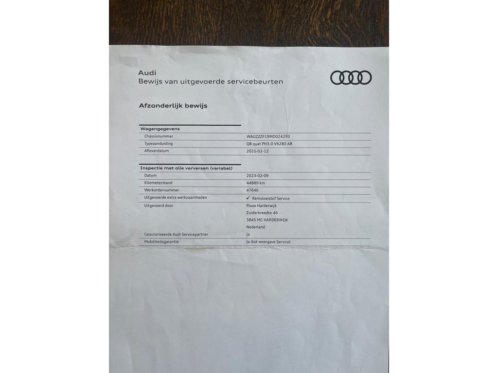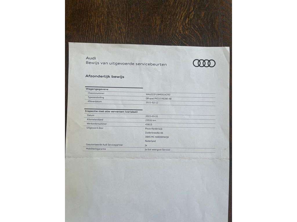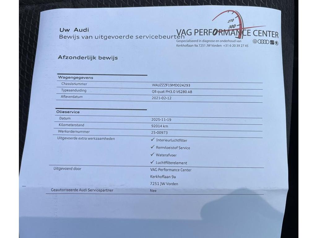 23” RSQ8 velgen, Accident Avoidance System, Achterbank verstelbaar, Achteruitrij assistent, Achteruitrijcamera, Adaptief Demping Systeem (ADS), Airbag(s) hoofd achter, Airbag(s) hoofd voor, Airbag(s) side voor, Airbag bestuurder, Airbag passagier, Airco separaat achter, Alarm klasse 3, Aluminium delen exterieur, Ambiance-verlichting interieur, Android Auto, Anti Blokkeer Systeem (ABS), Apple Carplay, Armsteun achter, Armsteun voor, Assistentie pakket Parking, Audio installatie premium, Automatische niveauregeling, Autotelefoonvoorbereiding met Bluetooth, Bandenspanningscontrolesysteem, Bang & Olufsen audio, Binnenspiegel automatisch dimmend, Bots herkenning en activatie, Bots waarschuwing systeem, Buitenspiegel(s) automatisch dimmend, Buitenspiegels elektrisch inklapbaar, Buitenspiegels elektrisch verstelbaar, Buitenspiegels in carrosseriekleur, Buitenspiegels verwarmbaar, Centrale deurvergrendeling met afstandsbediening, City-pakket, Comfortstoel(en), Connected services, Cruise control, Cruise control adaptief met Stop&Go, DAB-ontvanger, Dimlichten automatisch, Dodehoek detector, Electronic Stability Program (ESP), Electronic climate controle, Elektrisch bedienbare achterklep, Elektrisch bedienbare achterklep met sensorsturing, Elektrische ramen voor, Elektrisch glazen panorama-dak, Elektrisch verstelbare bestuurdersstoel, Elektrisch verstelbare bestuurdersstoel met geheugen, Elektrisch verstelbare passagiersstoel, Extra getint glas, File-assistent, Grootlicht-assistent, Hill hold-functie, Hoofdsteunen actief, Interieur voorverwarmingsinstallatie, Keyless-pakket, Keyless entry, Keyless start, Koplampen adaptief, Kruisend verkeer detectie, LED achterlichten, LED dagrijverlichting, LED koplampen, Lederen interieurdelen, Lederen stuurwiel, Lendesteunen (verstelbaar), Luchtvering, Luxe lederen bekleding, Matrix LED koplampen, Multimedia-voorbereiding, Navigatie full map, Oplaadmogelijkheid, Parkeer-assistent, Parkeersensor achter, Parkeersensor voor, Regensensor, Rijstrooksensor, Rondomzicht camera, Ruitensproeiers verwarmbaar, Schakelmogelijkheid aan stuurwiel, Sluitbekrachtiging, Start/stop systeem, Stoel ventilatie voor, Stuurbekrachtiging, Stuur verstelbaar, Stuurwiel multifunctioneel, Stuurwiel verwarmd, Tour pakket, Trekhaak, Trekhaak elektrisch uitklapbaar, Uitwijk assistent, Verkeersbord detectie, Verwarmde voorstoelen, Volledig digitaal instrumentenpaneel, Warmtewerend glas, WiFi voorbereiding, donkere hemelbekleding, dynamische knipperlichten, navigatiesysteem, panoramadak, softclose portieren