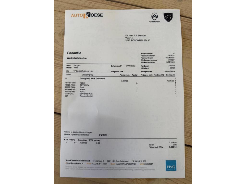 Plug-in hybride; Transmissie: 8 versnellingen, Automaat; Bandenmaat: 205/55 R19; Gecombineerd vermogen: 221 kW (300 PK); Vermogen elektromotor(en): 74 kW (101 PK); Vermogen brandstofmotor: 147 kW (200 PK); Laadvermogen: 515 kg; GVW: 2.330 kg; Max. trekgewicht: 1.250 kg (ongeremd 750 kg); LxBxH: 445 x 184 x 162 cm; Wielbasis: 268 cm; Aanwezige accu: gekocht; Acceleratie (0-100): 5,9 s; Topsnelheid: 235 km/u; Bekleding: Leder; Gemiddeld brandstofverbruik: 1,5 l/100km (1 op 66,7); CO₂-uitstoot: 165 g/km; Energielabel: A; Emissieklasse: Euro 6; Dealer onderhouden (onderhoudsboekjes aanwezig); 100% Onderhouden kwaliteitslabel aanwezig; 2 sleutels (2 handzenders); Garantielabel: BOVAG Garantie (12 maanden); BOVAG 40-Puntencheck; BOVAG Afleverbeurt; Motorrijtuigenbelasting: € 333 - € 365 per kwartaal; Inbegrepen afleverpakket: Afleverpakket. Bijzonderheden: Servicepakket Autobedrijf Rotterdam. Peugeot 3008 1.6 HYbrid4 300 GT. Kenteken: X-923-JB. = Bijzonderheden =. Terugroepactie uitgevoerd nieuwe accupakket ( t.w.v. € 7.229,00 factuur aanwezig ). Grote beurt gehad bij 50.485km en onderhoud historie aanwezig. 1. Olie Castrol edge 0W30 C3 longlife titanium. 2. Oliefilter (Merk: Bosch). 3. Luchtfilter (Merk: Bosch). 4. Interieurfilter (Merk: Bosch). 5. Brandstoffilter (Merk: Bosch). 6. Airco bijgevuld. 7. Nieuwe agm start/stop accu (Merk: Peugeot t.w.v. € 385,00 factuur aanwezig). 8. Nieuwe accupakket ( t.w.v. € 7.229,00 factuur aanwezig ). 9. Nieuwe apk bij aflevering. 10. Nieuwe luxe kentekenplaten. 11. Minimaal 25 liter brandstof in de tank. 12. Auto compleet gepoetst en gepolijst. 13. Waxoyl 100 plus lakbehandeling gehad (Merk: Waxoyl). 14. 12 maanden Bovag garantie. 15. Bovag 40-puntencheck garantie. 16. Rijklaarprijs direct uit voorraad leverbaar. 17. Wij rekenen geen afleveringskosten. Bedrijfsinformatie: Welkom bij Autobedrijf Rotterdam. Betrouwbaar, ruim aanbod, goed service en een eerlijke prijs, wij scoren 9.8. Autobedrijf Rotterdam bestaat sinds 2008 en staat bekend om exclusiviteit, service en garantie. Wij hebben altijd een ruim en gevarieerd aanbod jonge occasions voor een eerlijke prijs. Let op: 1. Bij ons inruil mogelijk. 2. Financiering mogelijk. 3. Verzekering mogelijk. 4. 12 maanden Bovag garantie. 5. Bovag 40 punten check garantie. 6. Voertuig tenaamstellen en vrijwaren op locatie. 7. Minimaal 25 liter brandstof in de tank. 8. Rijklaarprijs direct uit voorraad leverbaar. 9. Wij rekenen geen afleveringskosten. 1. Bij ons kunt u altijd uw auto inruilen ongeacht in welke prijsklasse u een auto bij ons koopt, wij zullen u altijd een eerlijk aanbod doen. U kunt altijd langs komen voor een vrijblijvend voorstel. 2. Heeft uw een leuke occasion gezien op onze website, maar op dit moment niet het gehele bedrag in een keer beschikbaar, dan kunt U via de link financiering eens bekijken wat eventueel mogelijk is bij aflossing in maandelijkse termijnen. 3. Uw garantie voor zorgeloos rijden. Autobedrijf Rotterdam heeft een begrip in Zuid-Holland en ver daar buiten. Autobedrijf Rotterdam staat bekend om exclusiviteit, service en garantie. Wij hebben altijd een ruim en gevarieerd aanbod jonge occasions voor een eerlijke prijs. Waarom autogarantie? Mochten er onvoorzien, binnen enkele maanden na aanschaf technische problemen ontstaan, bijvoorbeeld aan uw aandrijving, motor of versnellingsbak, dan biedt de autogarantie uitkomst. Neem contact met ons op voor meer informatie en mogelijkheden. Wilt u meer informatie over deze auto, dan kunt u ons altijd bellen met het volgende telefoonnummer 010 795 34 61. Autobedrijf Rotterdam. Berkenwoudestraat 15. 3076 JA Rotterdam. Telefoon NR: 010 795 34 61. Mobiel NR: 06 12 777 808. Email: info@autobedrijfrotterdam.com. Openingstijden. Maandag van 09:00 uur tot 17:00 uur. Dinsdag van 09:00 uur tot 17:00 uur. Woensdag van 09:00 uur tot 17:00 uur. Donderdag van 09:00 uur tot 17:00 uur. Vrijdag van 09:00 uur tot 17:00 uur. Zaterdag van 09:00 uur tot 17:00 uur. Zondag Gesloten. De koffie staat klaar!