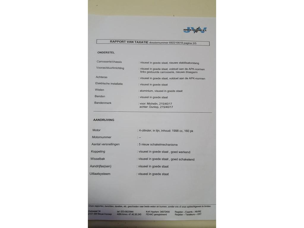 Achterbank in delen neerklapbaar, Achterruitwisser, Airbag(s) side voor, Airbag bestuurder, Airbag passagier, Airco, Anti Blokkeer Systeem (ABS), Armsteun achter, Bestuurdersstoel in hoogte verstelbaar, Boordcomputer, Brilliant kleur, Buitenspiegels elektrisch verstelbaar, Buitenspiegels verwarmbaar, Bumpers in carrosseriekleur, Cd-speler, Centrale deurvergrendeling met afstandsbediening, Dakspoiler, Derde remlicht, Elektrische ramen achter, Elektrische ramen voor, Gelaagde voorruit, Getint glas, Gordels achter, Gordelspanners, Hoofdsteunen Achter, Hoofdsteunen achter, Hoofdsteunen voor, Koplampen in hoogte verstelbaar, Lederen stuurwiel, Lichtmetalen velgen, Metallic lak, Met correcte Kilometer/ onderhoudshistorie, Met correcte Nationale autopas, Mistlampen voor, Niet rokersauto, Onderhoudsboekje aanwezig, Onderhoudshistory, Orig. Nederlandse auto, Recaro sportstoelen, Skiluik met skizak, Sportstoelen voor, Sproeier, Startblokkering, Stuurbekrachtiging snelheidsafhankelijk, Toerenteller, Tractie Controle Systeem (TCS), Velours bekleding, Verstelbaar stuur, Verstelbare stuurkolom