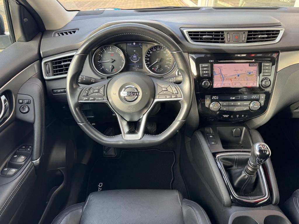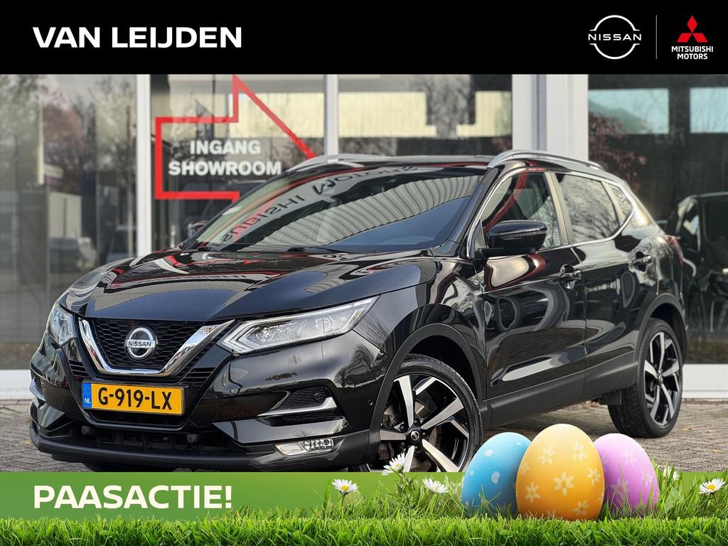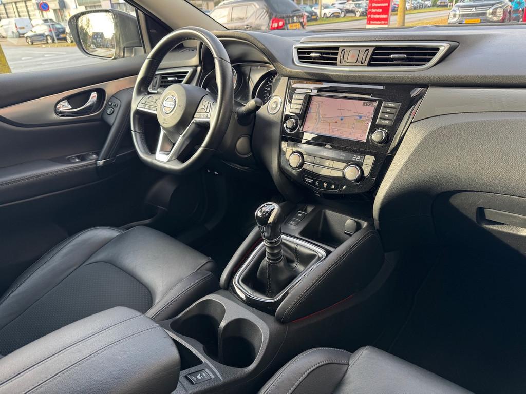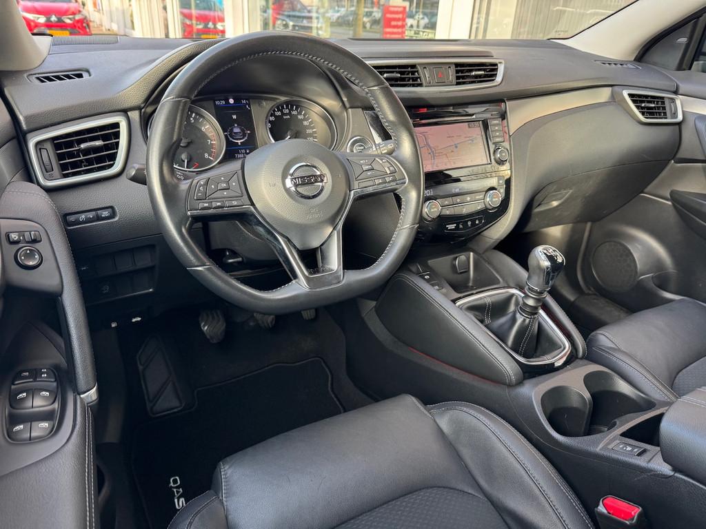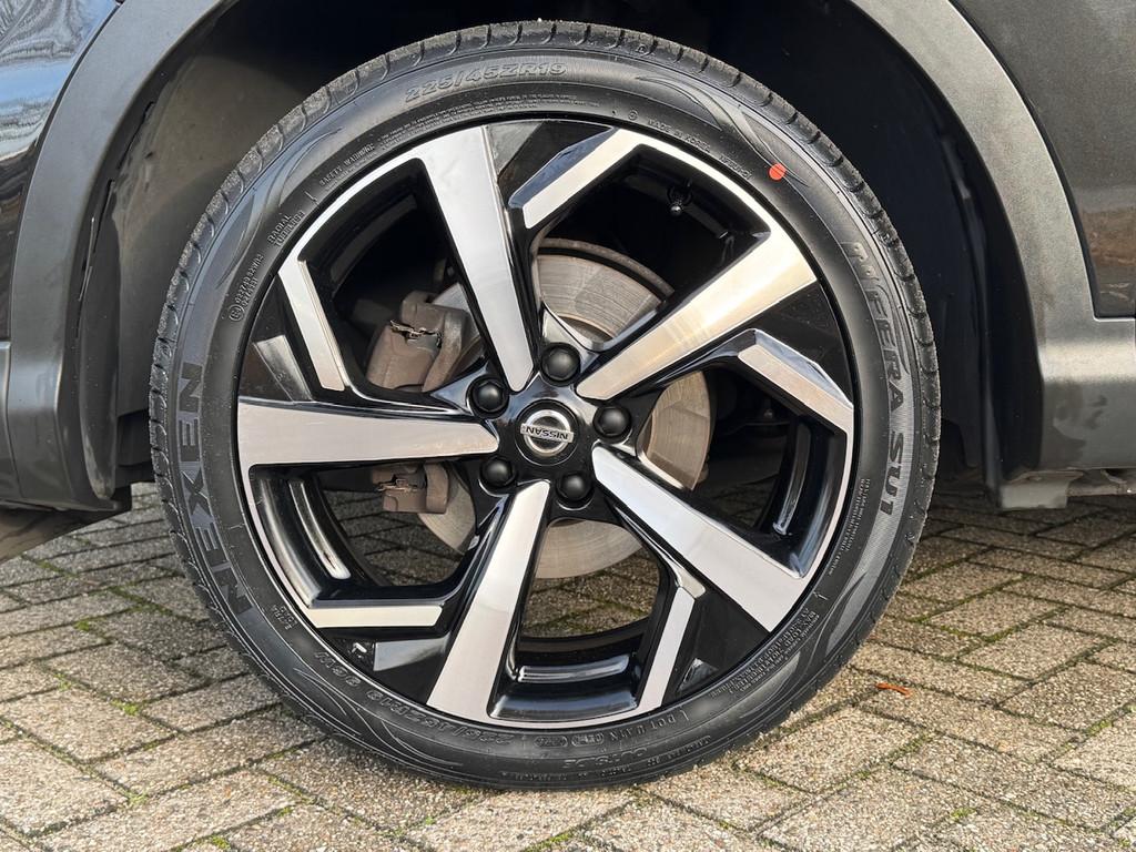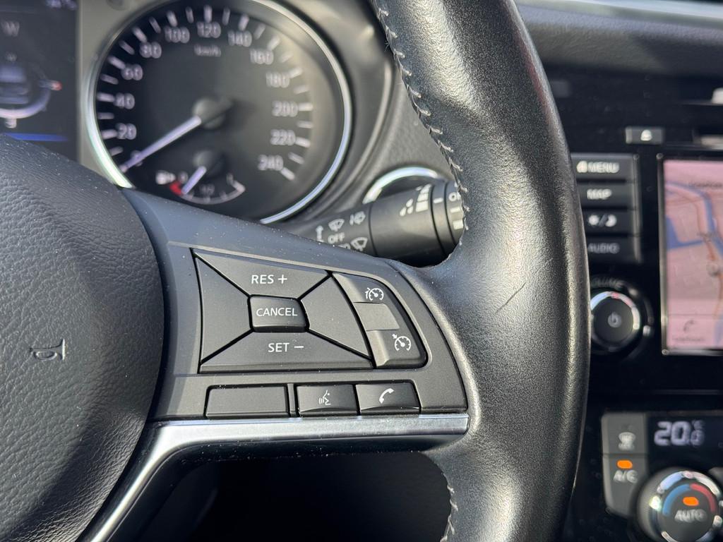 2 bekerhouders achter, 2 bekerhouders voor, 3-punts veiligheidsgordels achter, 3-punts veiligheidsgordels voor, 5'' Kleuren TFT instrumentenpaneel, 12V aansluiting, 19'' lichtmetalen velgen, ABS (Anti-blokkeersysteem), Achterbankleuning in delen neerklapbaar (60/40), Actieve hoofdsteunen voor, Android Auto, Apple Car Play, Audiosysteem met CD-speler, USB-aansluiting, stuurwielbediening en 6 luidsprekers, Autohold functie, Automatisch dimmende binnenspiegel, Automatisch in-/uitschakelende koplampen, Automatisch inklapbare buitenspiegels, Bandenspanningscontrolesysteem, Bi LED koplampen, Bluetooth, Buitenspiegelkappen in carrosseriekleur, Centrale deurvergrendeling met afstandsbediening, Chassis Control Systeem (Active Trace Control, Active Ride Control, Xtronic Active Engine Brake), Chromen raam omlijsting, Cruise control en speedlimiter met stuurwielbediening, Detectie van bewegende objecten, Digital audio broadcasting (DAB+), Dynamische bochtenverlichting, EBD (elektronische remkrachtverdeler), ESP (Electronic Stability Program), Elektrisch bedienbare ramen voor en achter met sneltoetsen, Elektrisch verstelbare bestuurdersstoel, Elektrisch verstelbare en verwarmbare buitenspiegels, Elektronische parkeerrem, Elektronische stuurbekrachtiging, Extra getint glas (achterste zijramen en achterruit), Flexibele bagageruimte indeling, Gescheiden automatische airconditioning (2 zones), Gordijn airbags, Haaienvin-antenne, Half lederen bekleding, Hoofdsteunen achter, ISOFIX-bevestigingspunten achter (2), In hoogte en diepte verstelbaar stuurwiel, In hoogte verstelbare bestuurdersstoel, In hoogte verstelbare passagiersstoel, Intelligent Key met startknop, Intelligente parkeerassistent, Interieur ambiance verlichting, LED dagrijverlichting met geïntegreerde knipperlichten, LED verlichting achter, Lederen stuurwiel en versnellingspookknop, Lendensteunverstelling voorstoelen, Metallic lak, Middenarmsteun achter, Middenarmsteun voor, Mistlampen voor, NBAS (Nissan Brake Assist), Nissan Around View Monitor, NissanConnect navigatie, Nissan Safety Shield Plus, Nissan safety shield, Panoramisch glazen dak, Parkeersensoren (voor/achter), Portiergrepen in carrosseriekleur, Regensensor, Reparatiekit voor de banden, Startonderbreking, Uitschakelbare passagiersairbag, Verwarmbare voorstoelen, Verwarmde voorruit, Voor- en zijairbags, Voorstoelen met sportdesign en geïntegreerde hoofdsteunen, Zilverkleurige dakrails, Zilverkleurige stylingplaten achterbumper, Zonnekleppen met verlichte make-up spiegel