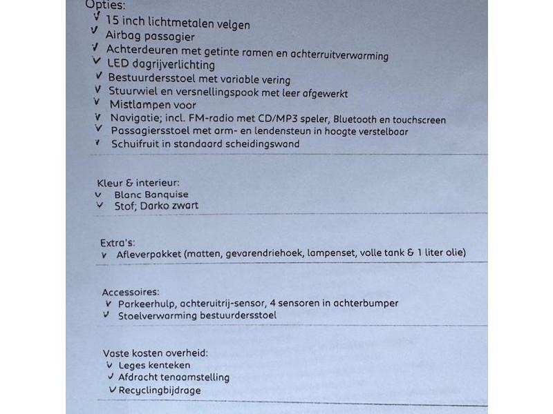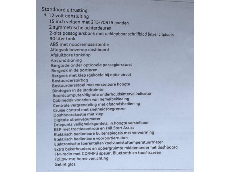 2 zitplaatsen rechtsvoor, Achteruitrijcamera, Airbag bestuurder, Airco, Anti Blokkeer Systeem, Anti Blokkeer Systeem (ABS), Armsteun voor, Autotelefoonvoorbereiding met Bluetooth, Bestuurdersstoel in hoogte verstelbaar, Boordcomputer, Buitenspiegels elektrisch inklapbaar, Centrale deurvergrendeling met afstandsbediening, Cruise control, Electronic Stability Program, Electronic Stability Program (ESP), Elektrische ramen voor, Halogeen mistlampen, LED Koplampen, LED dagrijverlichting, Lederen stuurwiel, Lendesteunen (verstelbaar), Navigatie, Navigatie-systeem full map, Parkeersensor achter, Parkeersensoren achter, Radio-CD/MP3 speler, Startblokkering, Stuur verstelbaar, Tussenschot volledig, Zijschuifdeur rechts