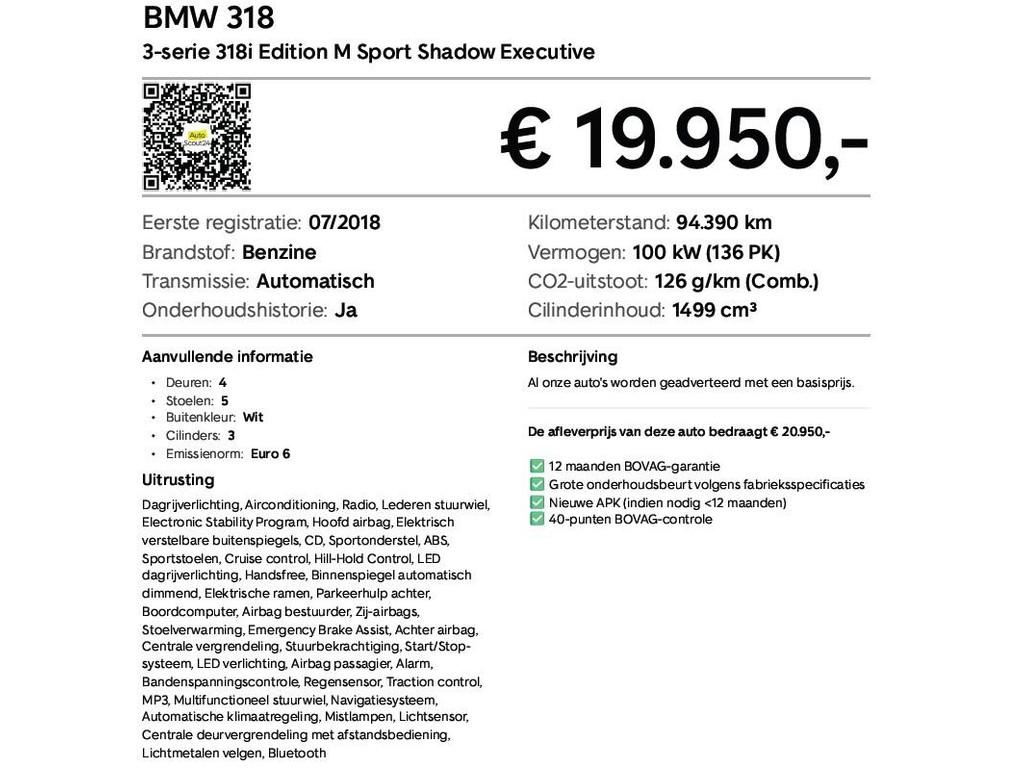 "Lichtmetalen velgen 17""", "Lichtmetalen velgen 18""", Achterbank in delen neerklapbaar, Achteropkomend verkeer waarschuwing, Airbag(s) hoofd achter, Airbag(s) hoofd voor, Airbag(s) side voor, Airbag bestuurder, Airbag passagier, Alarm klasse 3, Aluminium interieur afwerking, Anti Blokkeer Systeem (ABS), Armsteun voor, Autotelefoonvoorbereiding met Bluetooth, Bandenspanningscontrolesysteem, Bestuurdersstoel in hoogte verstelbaar, Binnenspiegel automatisch dimmend, Boordcomputer, Brake Assist System, Buitenspiegels elektrisch verstelbaar, Buitenspiegels in carrosseriekleur, Buitenspiegels verwarmbaar, Centrale deurvergrendeling met afstandsbediening, Comfort-pakket, Connected services, Cruise control, Dimlichten automatisch, Electronic Stability Program (ESP), Electronic climate controle, Elektrische ramen achter, Elektrische ramen voor, Hill hold-functie, LED achterlichten, LED dagrijverlichting, LED koplampen, LED mistlampen, Lederen bekleding, Lederen stuurwiel, M Aerodynamica, Multimedia-voorbereiding, Navigatie full map, Parkeersensor achter, Radio-CD/MP3 speler, Regensensor, Ruitensproeiers verwarmbaar, Sport Line, Sportonderstel, Sportstoelen, Sportstuur, Start/stop systeem, Stuurbekrachtiging snelheidsafhankelijk, Stuur verstelbaar, Stuurwiel multifunctioneel, Telefoonintegratie, Tractie Controle Systeem (TCS), Verwarmde voorstoelen