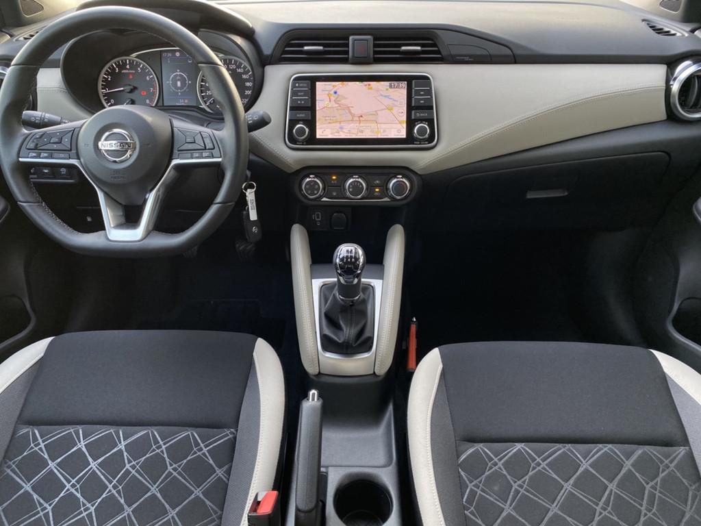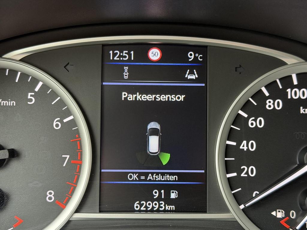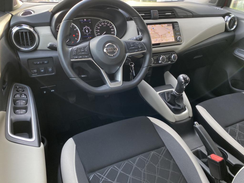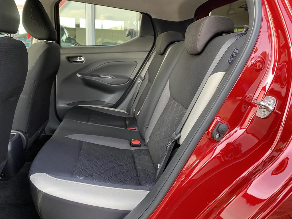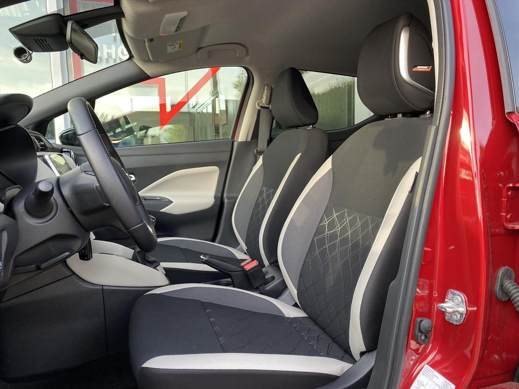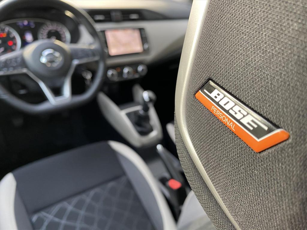 2 hoofdsteunen achter, 3-punts veiligheidsgordels achter (automatische oprolfunctie) (x3), 5'' Kleuren TFT instrumentenpaneel, 12V aansluiting, 60/40 neerklapbare achterbank, ABS (antiblokkeerremsysteem), Achterspoiler, Android Auto, Anti-vermoeidheidsstoelen voor, Apple Car Play, Armsteun voorportieren met grijze inzetstukken, Automatische inschakeling van de ruitenwisser achteraan bij het inschakelen van de achteruitversnelling, Automatisch in-/uitschakelende koplampen, BOSE Personal® Audio met 6 luidsprekers, Bandenreparatieset, Bekerhouders (2 voor en 1 achter), Bekleding stof 'modern' zwart met grijze inzetstukken en stiksels, Binnendeurengrepen in chroom, Bovenste deel van het dashboard in soft-touch materialen, Buitenspiegels in carrosseriekleur, Buitenspiegels met geïntegreerde LED-richtingaanwijzers, Centrale deurvergrendeling met afstandsbediening, Chassis Control Systeem (Active Trace Control, Active Ride Control), Cruise Control en snelheidsbegrenzer, Deurgrepen achteraan geïntegreerd in de achterstijl, Deurgrepen vooraan carrosseriekleur, EBD (elektronische remkrachtverdeler), ESP (Electronic Stability Program), Elektrische ruiten vooraan en achteraan, Elektrisch verstelbare buitenspiegels, elektrisch inklapbaar, Frontale airbags (uitschakelbare passagiersairbag), Getint glas, Gordelwaarschuwing, Gordijn airbags, Haaienvinantenne, Halogeen koplampen met lichtsignatuur, Handgreep passagierszijde (x1), High-Beam assist, Hill start assist, ISOFIX kinderstoel bevestigingspunten passagierszijde en achter, In hoogte en diepte verstelbaar stuurwiel, In hoogte verstelbare bestuurdersstoel, Intelligente noodremhulp (AEB), Intelligente noodremhulp (AEB) met voetgangerdetectie, Interieurverlichting en verlichting bedieningsknoppen elektrische ruiten, Kindersloten op de achterportieren, LED-verlichting dashboardkastje, LED dagrijverlichting, Lane departure warning, Lederen stuurwiel met stiksels, Manuele airconditioning, Metaalkleur, NBAS (Nissan Brake Assist), Navigatie, Nissan Connect, Opbergbakken in de binnenportieren voor en achter met flessenhouders, Opbergvak op de rugleuning van de passagiersstoel, Parkeersensoren achter, Regensensor met automatische ruitenwissers, Schakelindicator, Snelheidsafhankelijke stuurbekrachtiging, Start & Stop systeem, Startonderbreking, Stuurwielbedieningen: boordcomputer, audio, telefoon, snelheidsbegrenzer / cruise control, TPMS (bandenspanning controlesysteem), Traction Control System (TCS), Traffic Sign Recognition, Uitneembare bagage-afdekking, Veiligheidsgordels voor en achter met gordelspanners en spankrachtbegrenzers, Versnellingspookknop met satijnzilveren afwerking, Verstelbare hoofdsteunen voor, Verwarmde buitenspiegels, Voorbereiding voor radio, Zachte kniesteunen met stiksels, Zijdelingse airbags vooraan, Zonneklep voor bestuurder en passagier met make-up spiegeltje, kofferbakverlichting