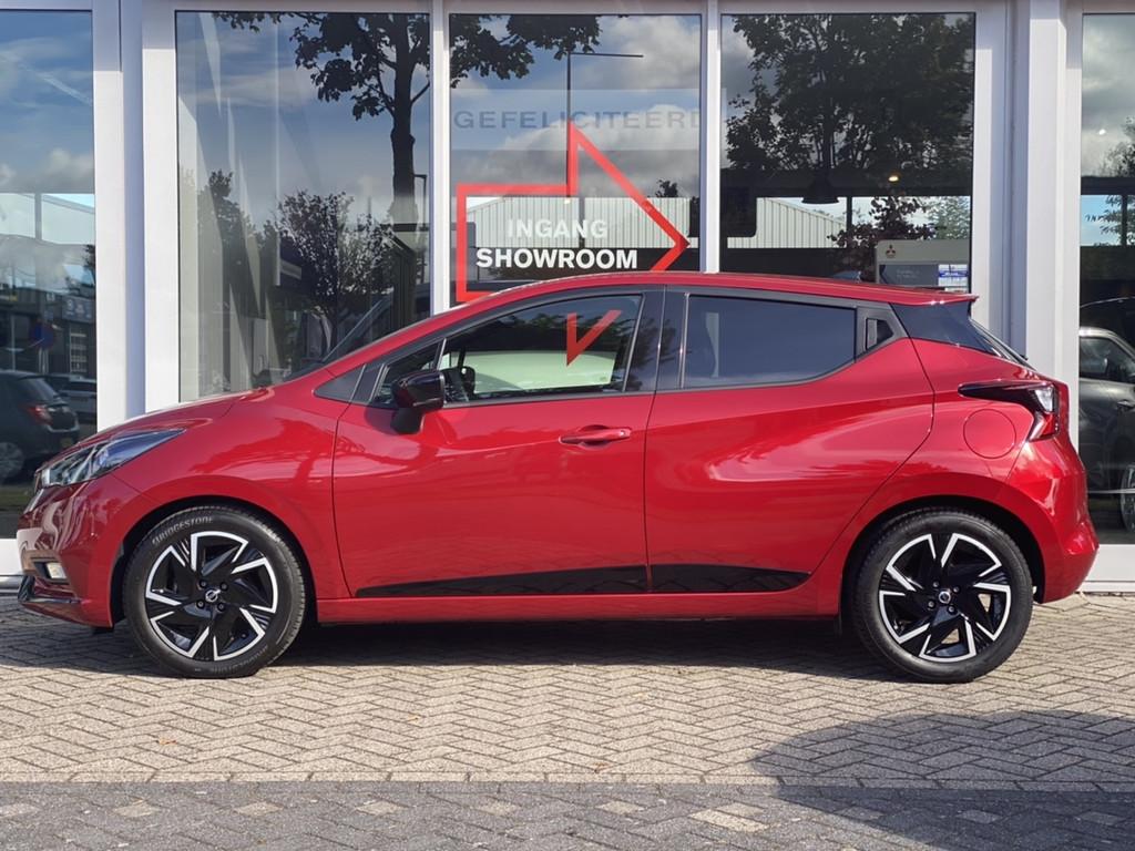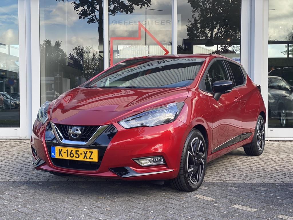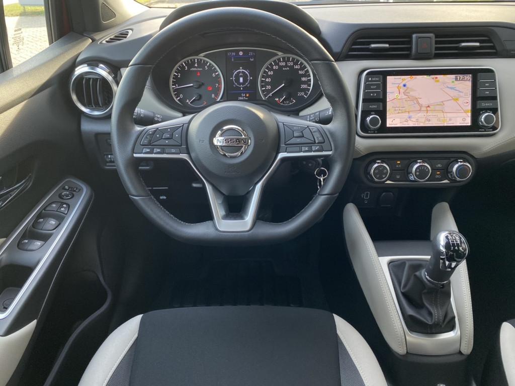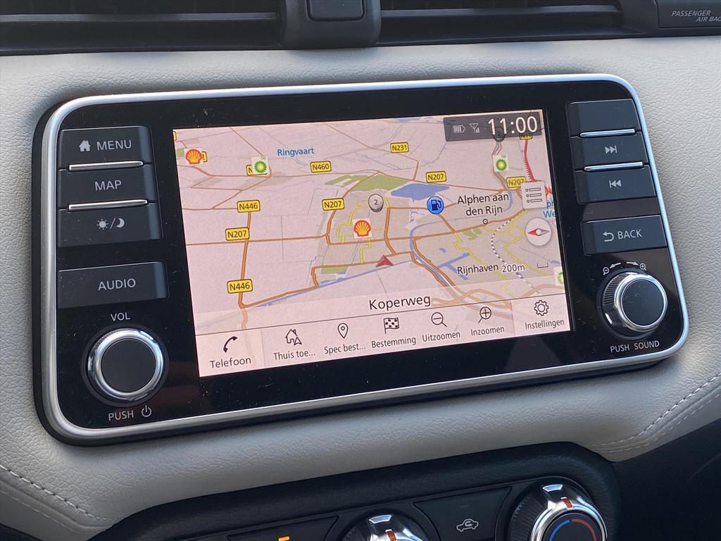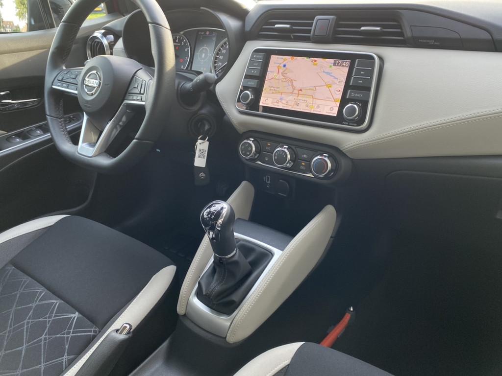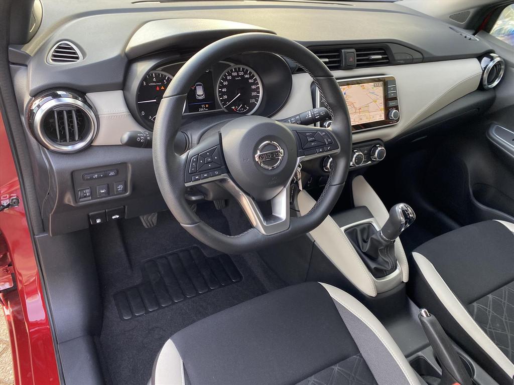 2 hoofdsteunen achter, 3-punts veiligheidsgordels achter (automatische oprolfunctie) (x3), 5'' Kleuren TFT instrumentenpaneel, 12V aansluiting, 60/40 neerklapbare achterbank, ABS (antiblokkeerremsysteem), Achterspoiler, Android Auto, Anti-vermoeidheidsstoelen voor, Apple Car Play, Armsteun voorportieren met grijze inzetstukken, Automatische inschakeling van de ruitenwisser achteraan bij het inschakelen van de achteruitversnelling, Automatisch in-/uitschakelende koplampen, BOSE Personal® Audio met 6 luidsprekers, Bandenreparatieset, Bekerhouders (2 voor en 1 achter), Bekleding stof 'modern' zwart met grijze inzetstukken en stiksels, Binnendeurengrepen in chroom, Bovenste deel van het dashboard in soft-touch materialen, Buitenspiegels in carrosseriekleur, Buitenspiegels met geïntegreerde LED-richtingaanwijzers, Centrale deurvergrendeling met afstandsbediening, Chassis Control Systeem (Active Trace Control, Active Ride Control), Cruise Control en snelheidsbegrenzer, Deurgrepen achteraan geïntegreerd in de achterstijl, Deurgrepen vooraan carrosseriekleur, EBD (elektronische remkrachtverdeler), ESP (Electronic Stability Program), Elektrische ruiten vooraan en achteraan, Elektrisch verstelbare buitenspiegels, elektrisch inklapbaar, Frontale airbags (uitschakelbare passagiersairbag), Getint glas, Gordelwaarschuwing, Gordijn airbags, Haaienvinantenne, Halogeen koplampen met lichtsignatuur, Handgreep passagierszijde (x1), High-Beam assist, Hill start assist, ISOFIX kinderstoel bevestigingspunten passagierszijde en achter, In hoogte en diepte verstelbaar stuurwiel, In hoogte verstelbare bestuurdersstoel, Intelligente noodremhulp (AEB), Intelligente noodremhulp (AEB) met voetgangerdetectie, Interieurverlichting en verlichting bedieningsknoppen elektrische ruiten, Kindersloten op de achterportieren, LED-verlichting dashboardkastje, LED dagrijverlichting, Lane departure warning, Lederen stuurwiel met stiksels, Manuele airconditioning, Metaalkleur, NBAS (Nissan Brake Assist), Navigatie, Nissan Connect, Opbergbakken in de binnenportieren voor en achter met flessenhouders, Opbergvak op de rugleuning van de passagiersstoel, Parkeersensoren achter, Regensensor met automatische ruitenwissers, Schakelindicator, Snelheidsafhankelijke stuurbekrachtiging, Start & Stop systeem, Startonderbreking, Stuurwielbedieningen: boordcomputer, audio, telefoon, snelheidsbegrenzer / cruise control, TPMS (bandenspanning controlesysteem), Traction Control System (TCS), Traffic Sign Recognition, Uitneembare bagage-afdekking, Veiligheidsgordels voor en achter met gordelspanners en spankrachtbegrenzers, Versnellingspookknop met satijnzilveren afwerking, Verstelbare hoofdsteunen voor, Verwarmde buitenspiegels, Voorbereiding voor radio, Zachte kniesteunen met stiksels, Zijdelingse airbags vooraan, Zonneklep voor bestuurder en passagier met make-up spiegeltje, kofferbakverlichting