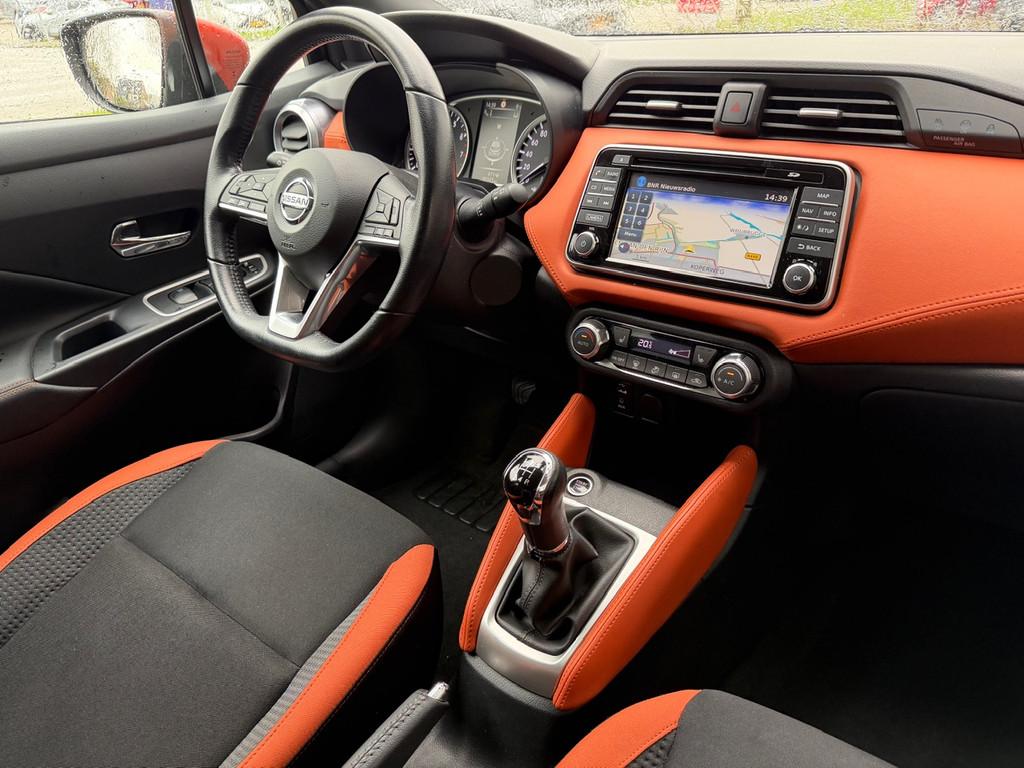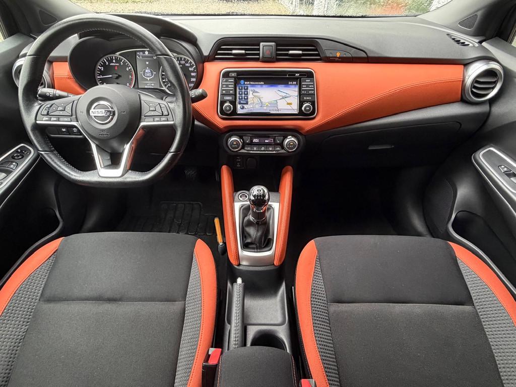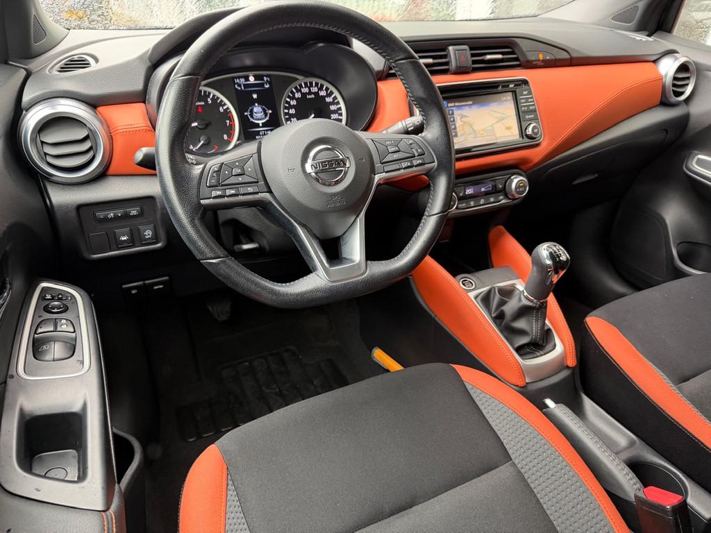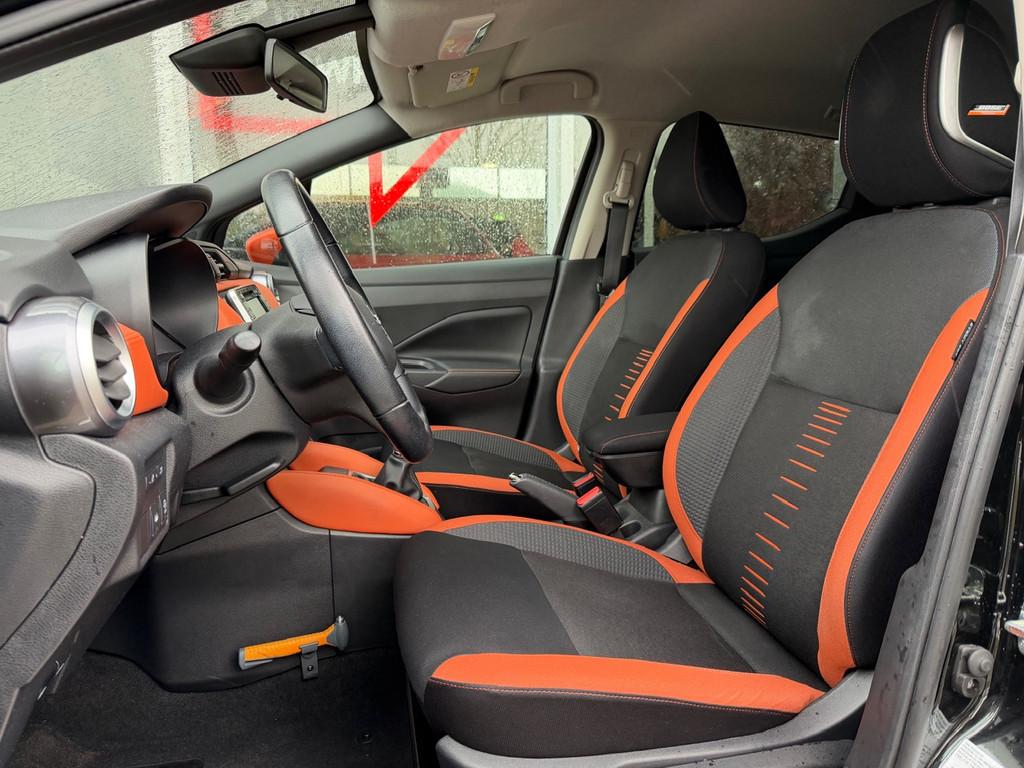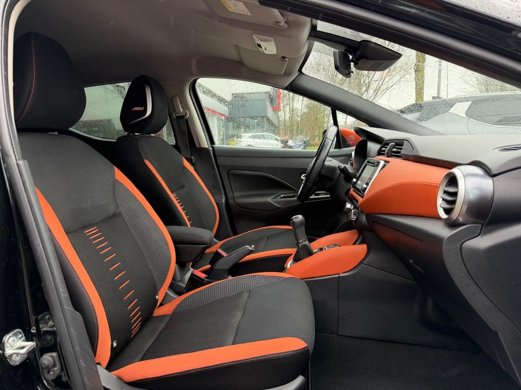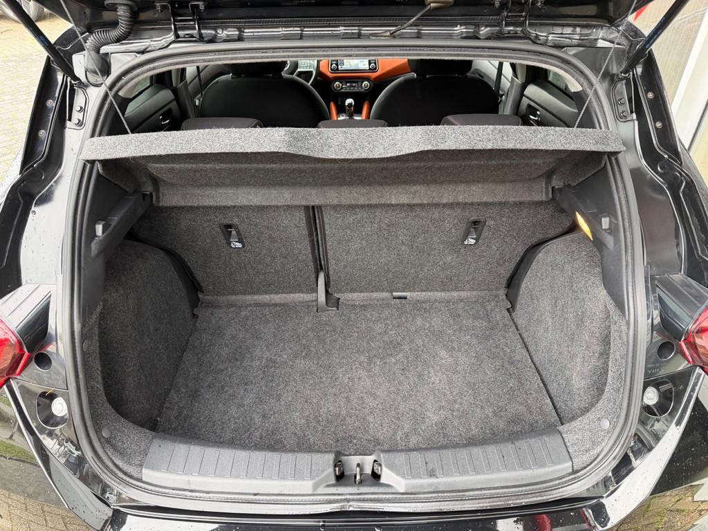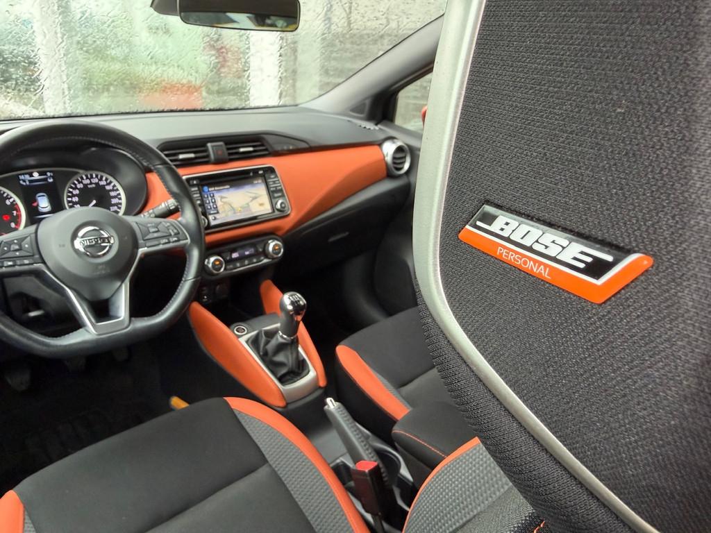 3 hoofdsteunen achter, 3-punts veiligheidsgordels achter (automatische oprolfunctie) (x3), 5'' Kleuren TFT instrumentenpaneel, 12V aansluiting, 17'' Lichtmetalen velgen met bijhorende kleureninserts, 60/40 neerklapbare achterbank, ABS (antiblokkeerremsysteem), Accenten op dashboard, deuren en stoelen in energy orange, Accubeschermingssysteem: automatische uitschakeling van koplampen en binnenverlichting bij vergeten, Achterspoiler, Achteruitrijcamera en parkeersensoren, All season banden, Armsteun voorportieren en dashboard in synthetisch leder, Automatische airconditioning, Automatische inschakeling van de ruitenwisser achteraan bij het inschakelen van de achteruitversnelling, Automatisch in-/uitschakelende koplampen, Bandenreparatieset, Bekerhouders (2 voor en 1 achter), Bekleding stof 'absolute' zwart met grijze inzetstukken en stiksels, Binnendeurengrepen in chroom, Bovenste deel van het dashboard in soft-touch materialen, Buitenspiegels in carrosseriekleur, Buitenspiegels met geïntegreerde LED-richtingaanwijzers, Centrale deurvergrendeling met afstandsbediening, Cruise Control en snelheidsbegrenzer, Deurgrepen achteraan geïntegreerd in de achterstijl, Deurgrepen vooraan carrosseriekleur, EBD (elektronische remkrachtverdeler), ESP (Electronic Stability Program), Elektrische ruiten voor en handbediende achter, Elektrisch verstelbare buitenspiegels, elektrisch inklapbaar, Exclusive Bose styling set, Frontale airbags (uitschakelbare passagiersairbag), Getint glas, Gordelwaarschuwing, Gordijn airbags, Halogeen koplampen met lichtsignatuur, Handremgreep met leder bekleed, Hill start assist, ISOFIX kinderstoel bevestigingspunten passagierszijde en achter, In hoogte en diepte verstelbaar stuurwiel, In hoogte verstelbare bestuurdersstoel, Intelligente grootlichten, Intelligente noodremhulp (AEB) met voetgangerdetectie, Intelligent key met STOP/START knop, Intellingent Around View Monitor, Interieurverlichting en verlichting bedieningsknoppen elektrische ruiten, Kindersloten op de achterportieren, LED-verlichting dashboardkastje, LED dagrijverlichting, LED koplampen, Lederen stuurwiel met stiksels, Lederen versnellingspookknop met satijnzilveren afwerking, Metaalkleur, Mistlampen voor, NBAS (Nissan Brake Assist), NissanConnect navigatie, Opbergbakken in de binnenportieren voor en achter met flessenhouders, Opbergvak op de rugleuning van de passagiersstoel, Regensensor met automatische ruitenwissers, Rijbaan-assistent, Schakelindicator, Snelheidsafhankelijke stuurbekrachtiging, Spiegelkappen in energy orange, Standaard lakkleur, Start & Stop systeem, Startonderbreking, Stuurwielbedieningen: boordcomputer, audio, telefoon, snelheidsbegrenzer / cruise control, Systeem Bose Personal Audio met 6 luidsprekers, TPMS (bandenspanning controlesysteem), Traction Control System (TCS), Trekhaak, Trekhaak afneembaar, Uitlaatafwerking, Uitneembare bagage-afdekking, Veiligheidsgordels voor en achter met gordelspanners en spankrachtbegrenzers, Verkeersbordherkenning, Verstelbare hoofdsteunen voor, Verwarmbare voorstoelen, Verwarmde buitenspiegels, Voor- en achterbumperafwerking in energy orange, Voorbereiding voor radio, Zachte kniesteunen met stiksels, Zijdelingse airbags vooraan, Zijstrips in energy orange, Zonneklep voor bestuurder en passagier met make-up spiegeltje, kofferbakverlichting