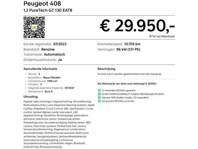 "Lichtmetalen velgen 19""", Accident Avoidance System, Achterbank in delen neerklapbaar, Achteropkomend verkeer waarschuwing, Achteruitrijcamera, Alcantara bekleding, Aluminium interieur afwerking, Android Auto, Anti Blokkeer Systeem (ABS), Apple Carplay, Armsteun achter, Armsteun voor, Audio installatie premium, Autotelefoonvoorbereiding met Bluetooth, Binnenspiegel automatisch dimmend, Bots waarschuwing systeem, Buitenspiegels elektrisch inklapbaar, Connected services, Cruise control adaptief met Stop&Go, DAB-ontvanger, Dimlichten automatisch, Electronic climate controle, Elektrisch bedienbare achterklep, Elektrische ramen achter, Elektrische ramen voor, Extra getint glas, Geluidwerend glas, Keyless entry, Keyless start, LED achterlichten, LED dagrijverlichting, Lendesteunen (verstelbaar), Metallic lak, Navigatie full map, Pack City, Parkeersensor achter, Parkeersensor voor, Regensensor, Rijstrooksensor met correctie, Rondomzicht camera, Sportstoelen, Sportstuur, Startblokkering, Stuurbekrachtiging snelheidsafhankelijk, Stuur verstelbaar, Stuurwiel multifunctioneel, Stuurwiel verwarmd, Telefoonintegratie premium, Verkeersbord detectie, Vermoeidheids herkenning, Volledig digitaal instrumentenpaneel, Voorstoelen in hoogte verstelbaar