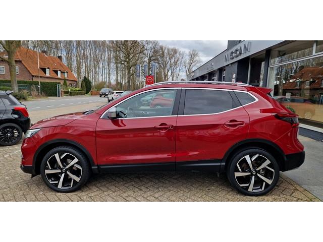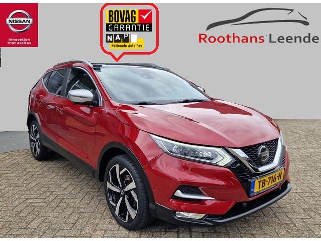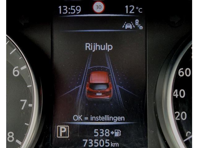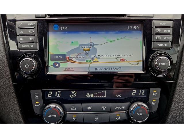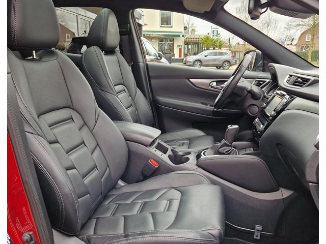 3-punts veiligheidsgordels achter, 3-puntsveiligheidsgordels voor, 5'' Kleuren TFT instrumentenpaneel, 7" LCD DVD-navigatiesysteem met TMC, MP3, stemherkenning en achteruitrijcamera in kleur, 12 Volt aansluiting, 19'' lichtmetalen velgen, ABS (Anti-blokkeersysteem), AVM (Around View Monitor) en 360° panoramisch zicht, Achterbankleuning in delen neerklapbaar (60/40), Actieve hoofdsteunen voor, Airbag voorpassagier uitschakelbaar, Armsteun bestuurdersstoel, Automatische verkeersborden herkenning, Automatisch in-/uitschakelende koplampen, Automatisch inklapbare buitenspiegels, Bi LED koplampen, Binnenspiegel met automatische dimmer, Bluetooth - voor handsfree bellen, Centrale armsteun achterin, Centrale portiervergrendeling, Chassis Control Systeem (Active Trace Control, Active Ride Control, Xtronic Active Engine Brake), Chromen raam omlijsting, Cruise control en speedlimiter met stuurwielbediening, Detectie van bewegende objecten, Dode hoek waarschuwing, ESP met deactivatieschakelaar, Elektrisch bedienbare ramen achter, Elektrisch bedienbare ramen voor, Elektrische stuurbekrachtiging, Elektrisch verstelbare bestuurdersstoel, Elektrisch verstelbare en verwarmbare buitenspiegels, Elektronische Remkracht verdeling (EBD), Elektronische handrem, Extra getint glas (achterste zijramen en achterklep), Flexibele bagageruimte indeling, Frontale botsing bescherming (AEB), Gescheiden automatische airconditioning (2 zones), Grootlicht met adaptieve dimstand, Hill start assist, Hoofdsteunen achter, ISOFIX-bevestigingspunten voor 2 kinderzitjes, In hoogte verstelbaar stuurwiel, In hoogte verstelbare bestuurdersstoel, In hoogte verstelbare passagiersstoel, Intelligent Key, Intelligente parkeerassistent, Interieur ambiance verlichting, LED Signature Dagrijverlichting, Lederen stuurwiel en versnellingspookknop, Lendensteunverstelling voorstoelen, Metallic lak, Mistlampen voor, NBAS (Nissan Brake Assist), Panoramisch glazen dak, Parkeersensoren (voor/achter), Portiergrepen in carrosseriekleur, Radio/CD speler met USB-aansluiting, stuurwielbediening en 6 luidsprekers, Regensensor, Reparatiekit voor de banden, Rijbaan-assistent, Standaard lakkleur, Start/stop knop, Startonderbreking (NATS), TPMS (Tire pressure monitoring system), Trekhaak, Vermoeiheids waarschuwing, Verwarmbare voorstoelen, Verwarmde voorruit, Voor, Zij en Gordijn airbags, Zilverkleurige dakrails, Zonnekleppen met make-up spiegel en afsluiting, Zwarte stootlijsten, Zwart lederen stoelbekleding